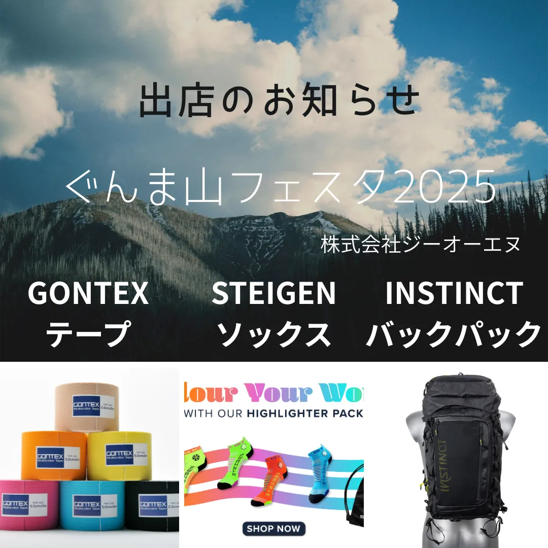 今回のぐんま山フェスターではGONTEXテープのみならず、登山やトレイルランニングに使用できるフランスからの輸入品であるINSTINCTというブランドのザックとオーストラリアから輸入しているランニング専用ソックSTEIGENを展示販売させていただく予定です。登山やクライミング、トレイルランにぐやランニングのアクティビティにトラブルを抱えている方へ是非弊社ブースまでお越しください。皆さまのご来場心よりお待ちしております。